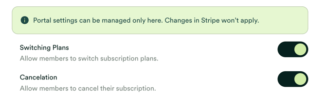 When Customer Portal access is enabled, use these settings to control whether your members can switch plans or cancel their current subscription directly within the portal.